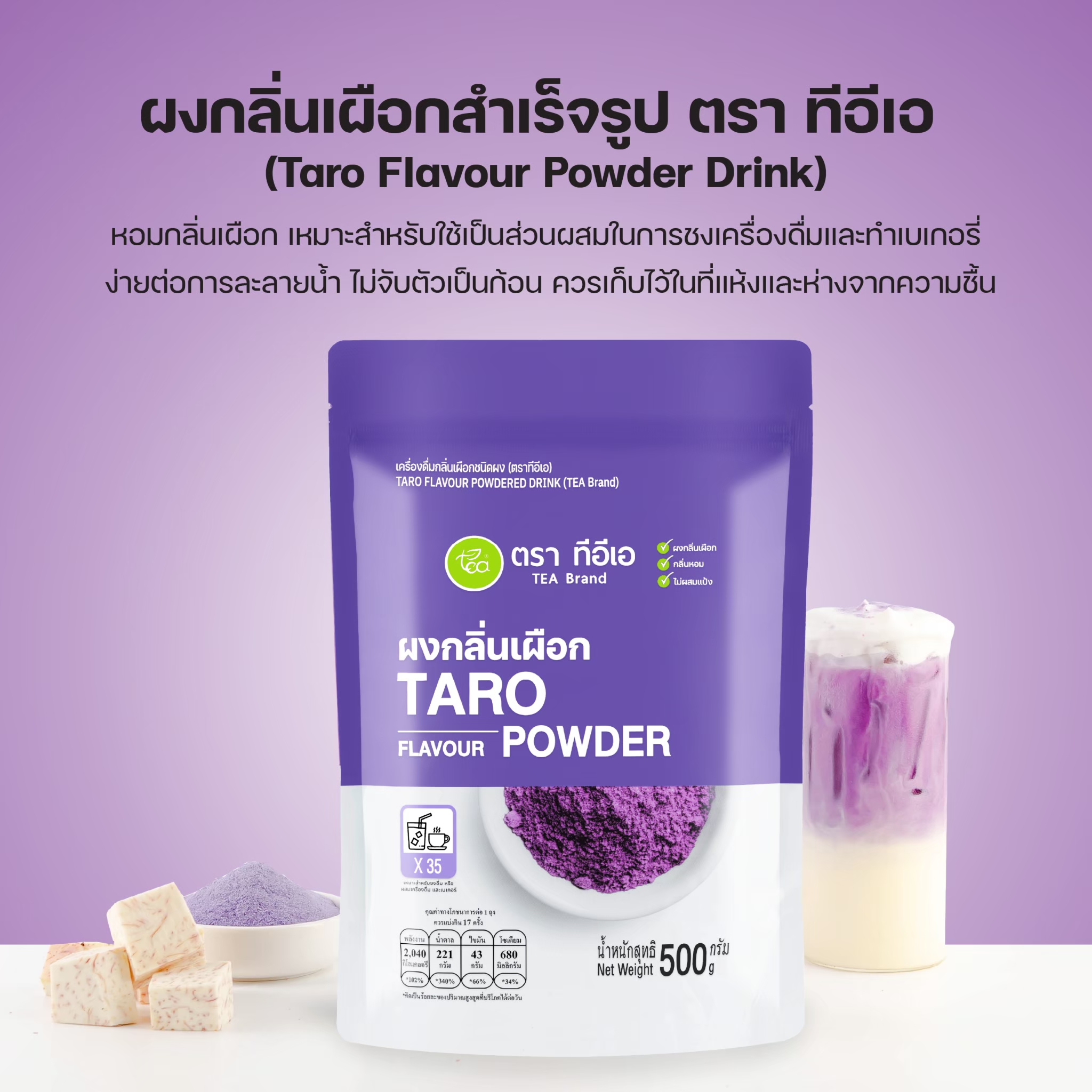 Taro powder with a scent of taro that is fragrant, soft, mellow, and has a round and comforting taste similar to real taro milk. It is delicious and easy to make into various dishes, both beverages and desserts.