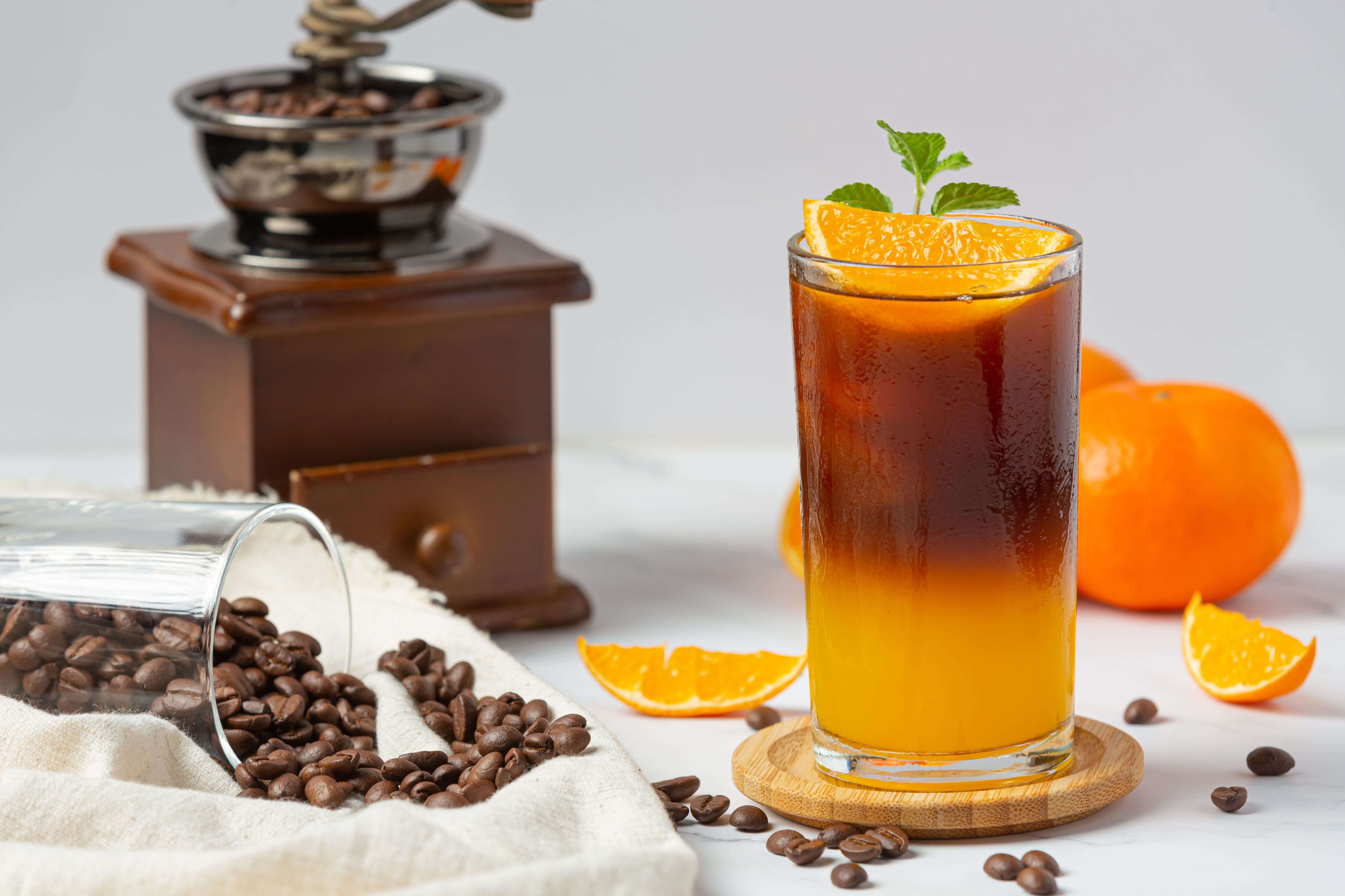 ใช้ กาแฟสกัดเย็น หรือ กาแฟ โคลบรูว อย่าง กาแฟกาเบ้เฮ้าส์ กาแฟเกาหลี กับผลไม้ที่สดใหม่ เช่น ส้ม มะนาว แอปเปิ้ล หรือผลไม้เบอร์รีอื่น ๆ เพื่อให้รสชาติเป็นผลไม้กับกาแฟที่เข้มข้น
