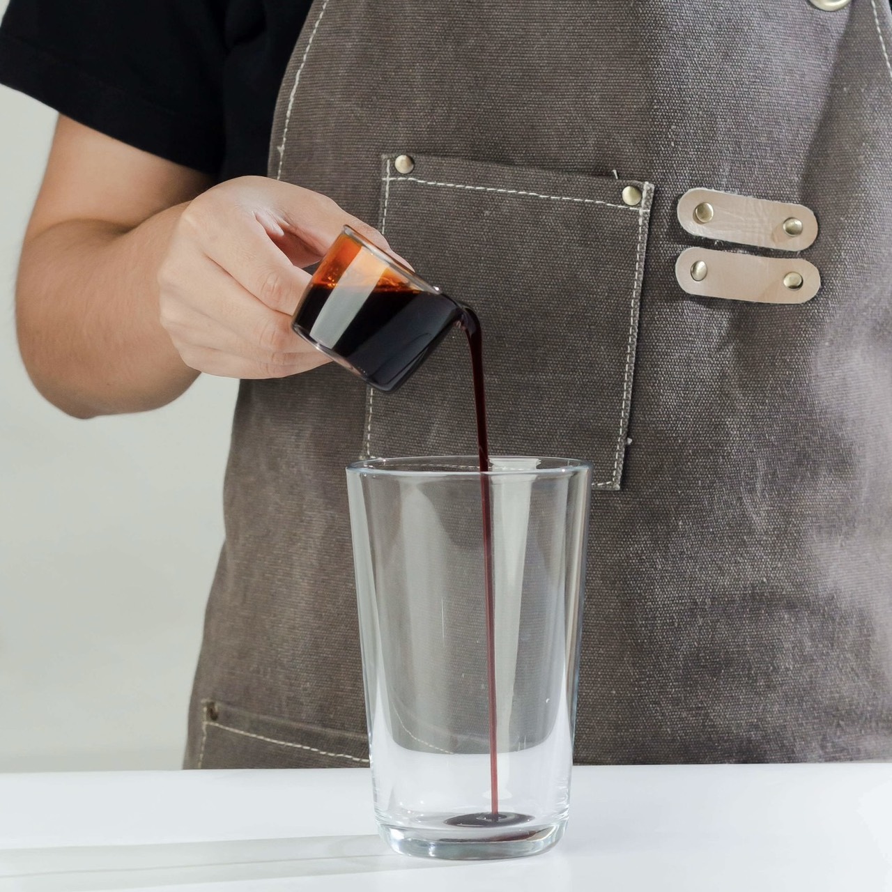 2. เติมน้ำแข็งลงในแก้วผสม ใส่น้ำเชื่อม 15 มล.